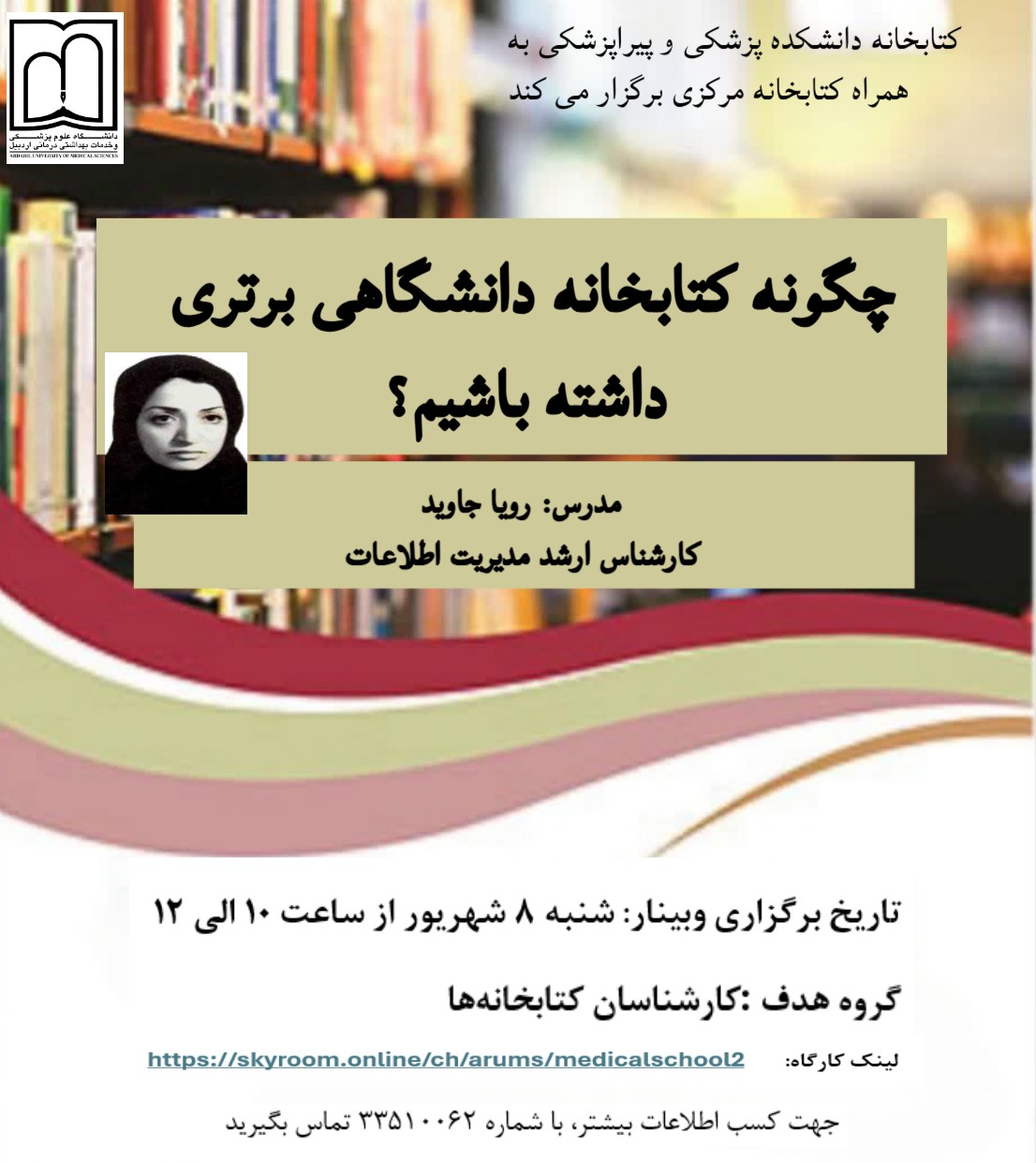 کتابخانه دانشکده پزشکی و پیراپزشکی با همکاری کتابخانه مرکزی،کارگاه تخصصی «چگونه کتابخانه دانشگاهی برتری داشته باشیم؟» را برگزار می کند. این کارگاه هشتم شهریورماه ۱۴۰۴ از ساعت ۱۰ الی ۱۲ به صورت وبینار و با تدریس سرکار خانم رویا جاوید، ویژه پرسنل محترم کتابخانه‌های دانشگاه علوم پزشکی اردبیل تشکیل خواهد شد.